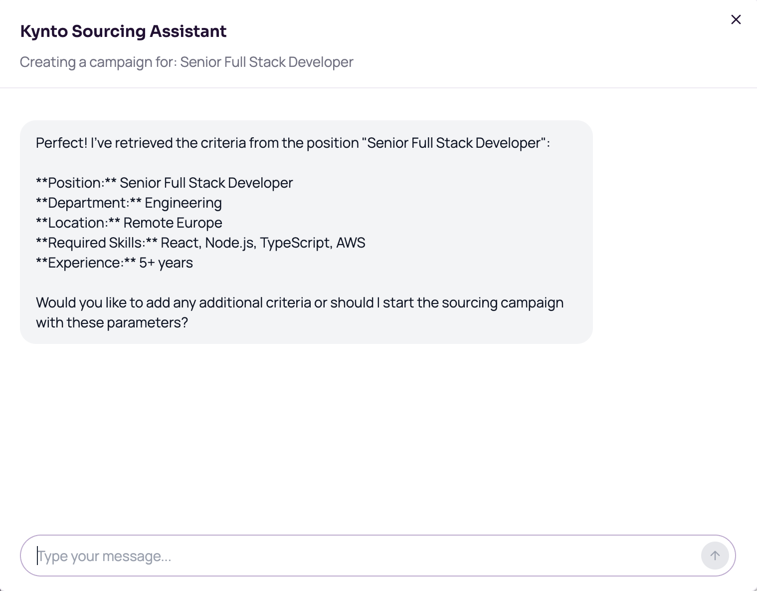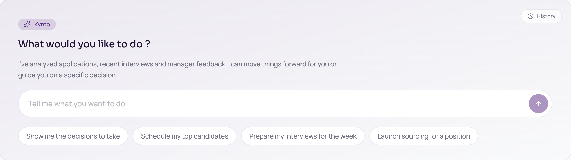 Your scorecards, your culture, your past hiring decisions — Kynto absorbs all of it and uses that context to produce results that actually match what you're looking for.