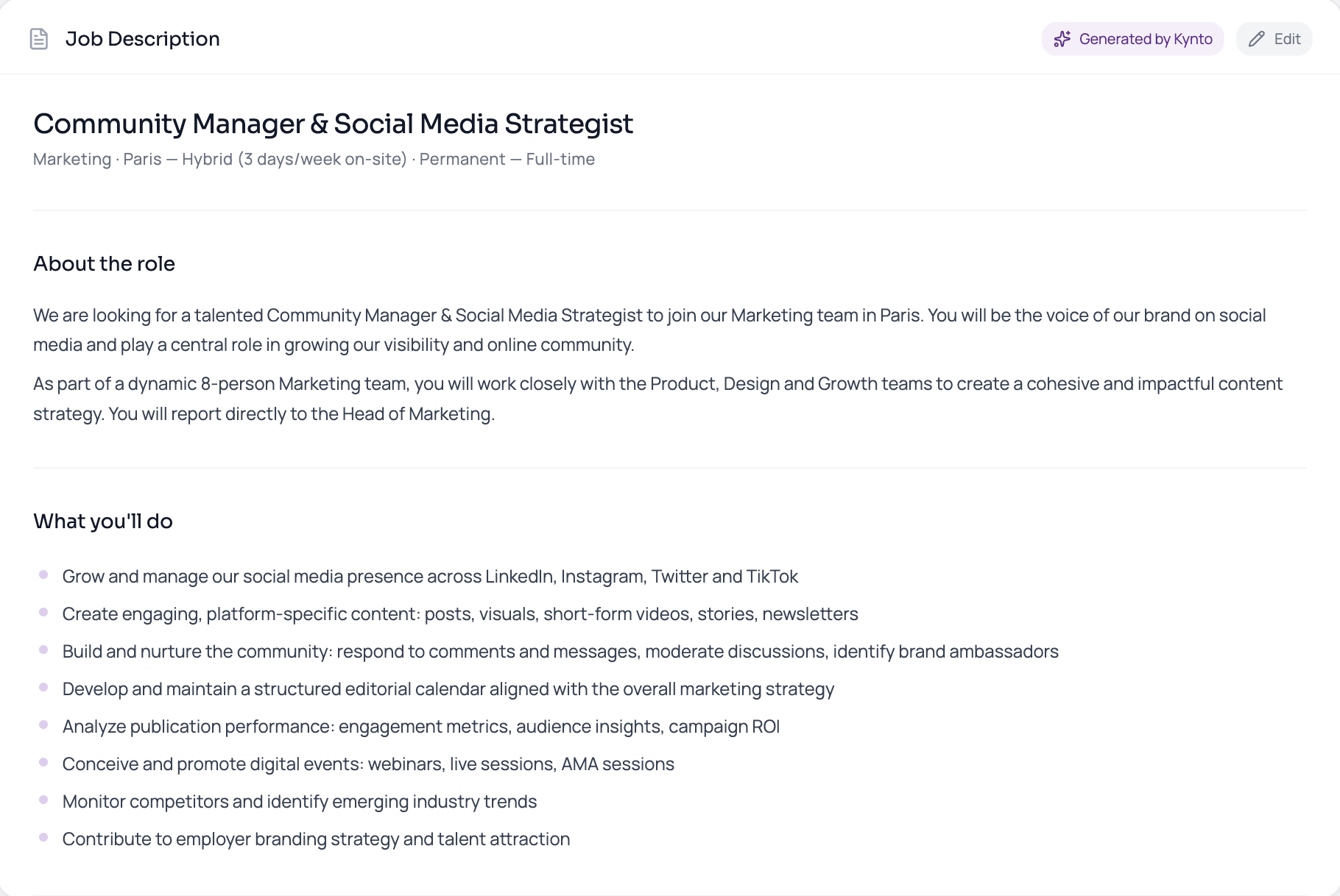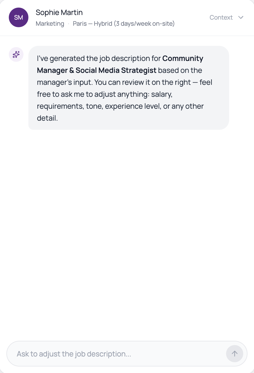 Turn hiring intent into clear, structured job descriptions in minutes.
